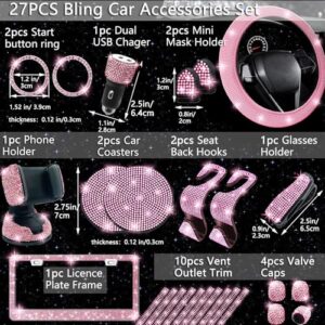 NBTEPEM 27-Piece Bling Car Accessories Set – Universal Fit Steering Wheel Covers, License Plate Frames, Phone Holder, Car Fast Charger, Coasters (Pink)